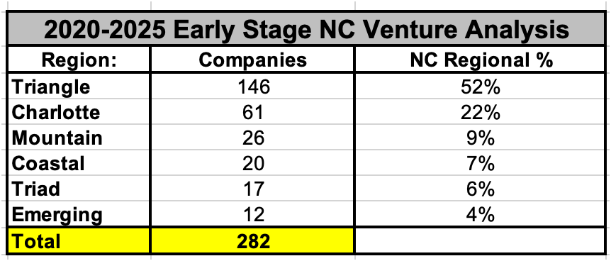 We did an analysis based on Pitchbook data for NC companies that raised pre-seed/seed rounds in the $500k-5m range excluding biotech and service businesses. Here’s the breakdown: