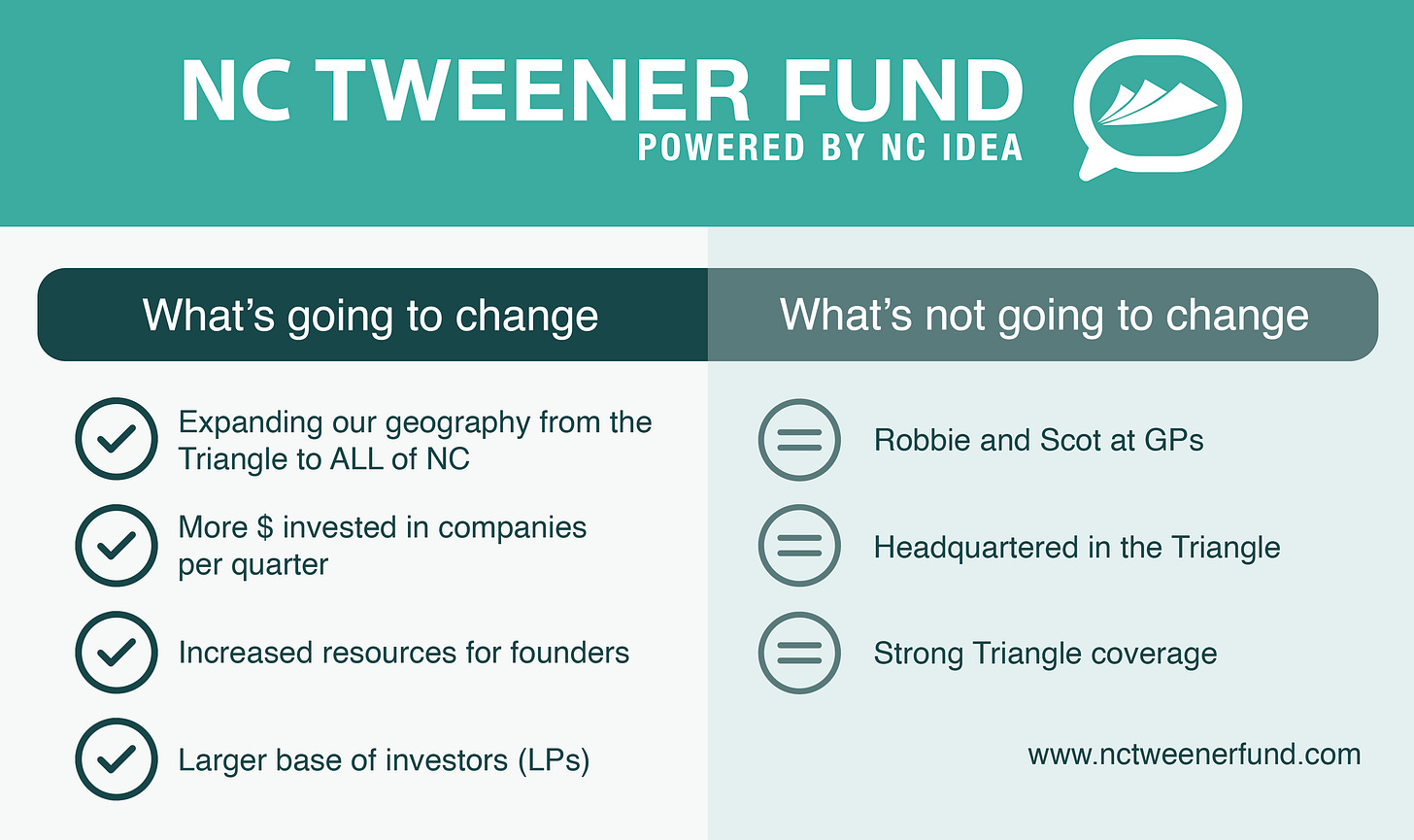 NC Tweener Fund will continue to be HQ’d in the Triangle (at Raleigh Founded, North St)