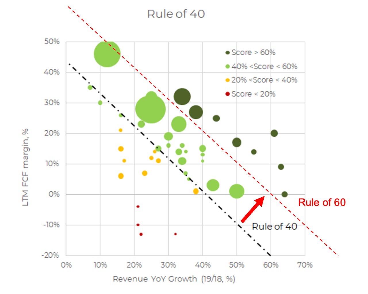 Above, I pulled a graph from Tony Fedorov’s article explaining the rule of 40. While it’s dated, I’ve added this new rule of 60 line to show what we mean.