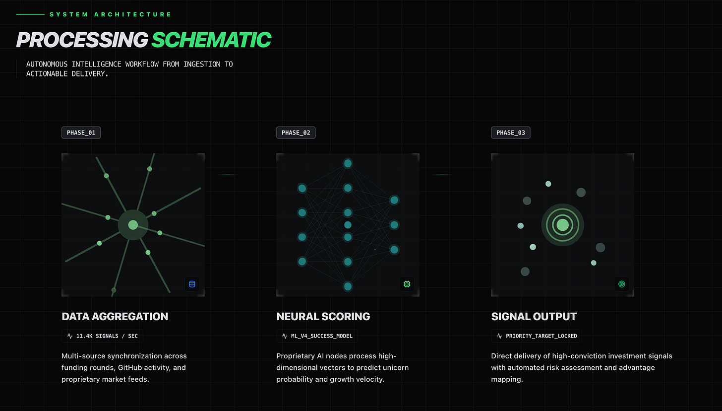 The platform aggregates signals from funding rounds, GitHub activity, investor networks, and ecosystem relationships to identify promising startups before they become obvious.