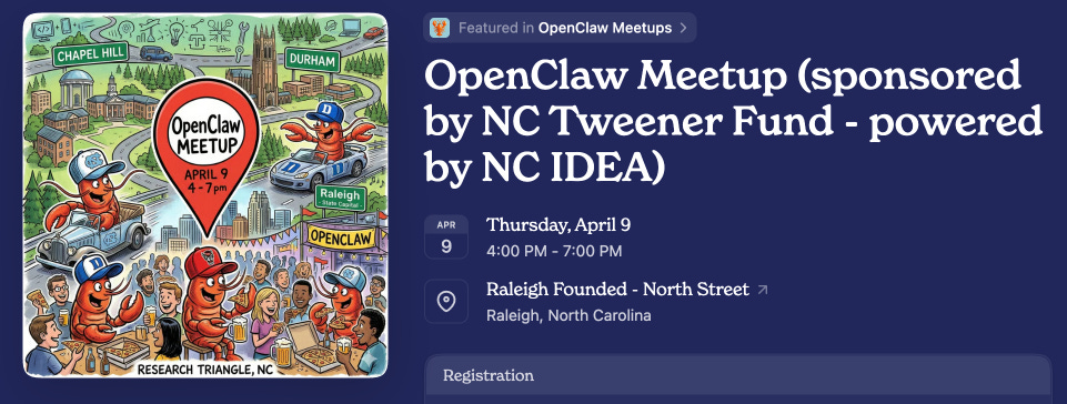 We are excited to host the Triangle's first ever OpenClaw Meetup on April 9 at Raleigh Founded (North St. Location) from 4-7pm.
