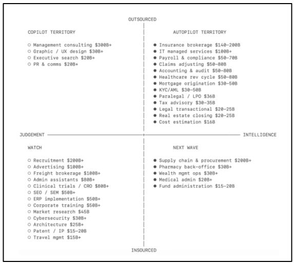 The big insight is that the total market for work is far larger than the market for software. If AI can deliver the outcome directly (accounting, insurance brokerage, legal drafting, procurement) companies may buy the result instead of the tool.