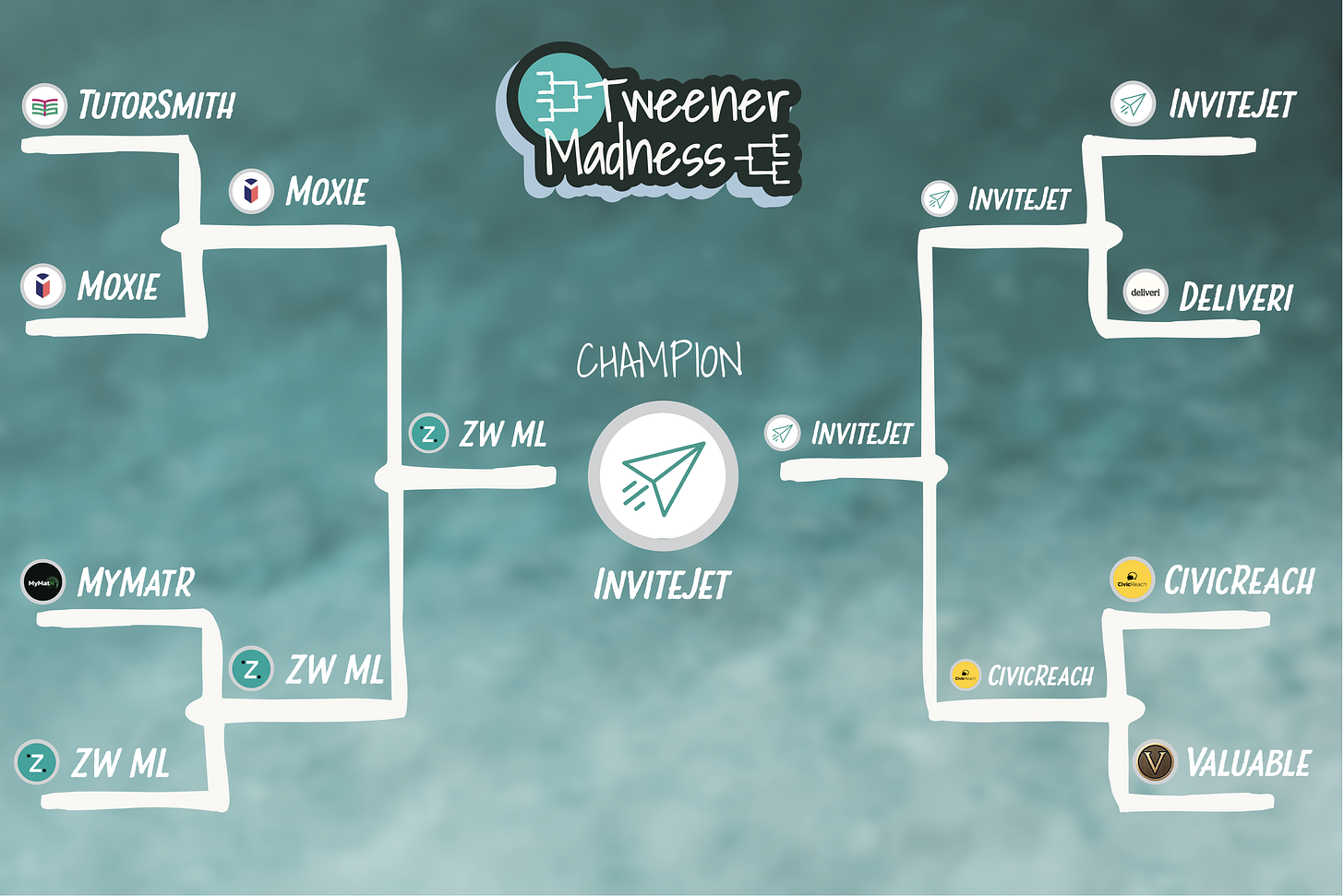 The 2025 Tweener Madness Champion: InviteJet. A MarTech company founded by Paul Davis and Brian Watson, InviteJet advanced through a competitive field to win the $25,000 investment prize and earn the 2025 title.