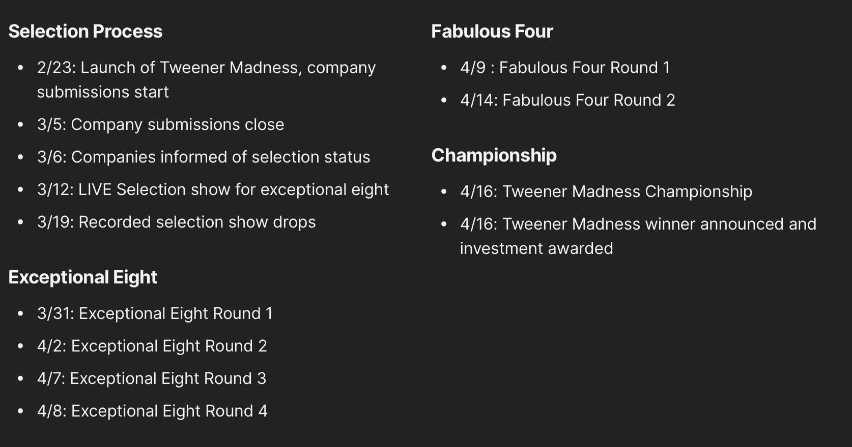 Applications are open from February 23 through March 5 at 12:00 PM. On March 6, companies will be notified of their selection status. On March 12, we’ll host a live-streamed Selection Show revealing the Exceptional Eight. From there, the tournament unfolds through recorded rounds, culminating in the April 16 Championship where the 2026 Tweener Madness winner will be announced.