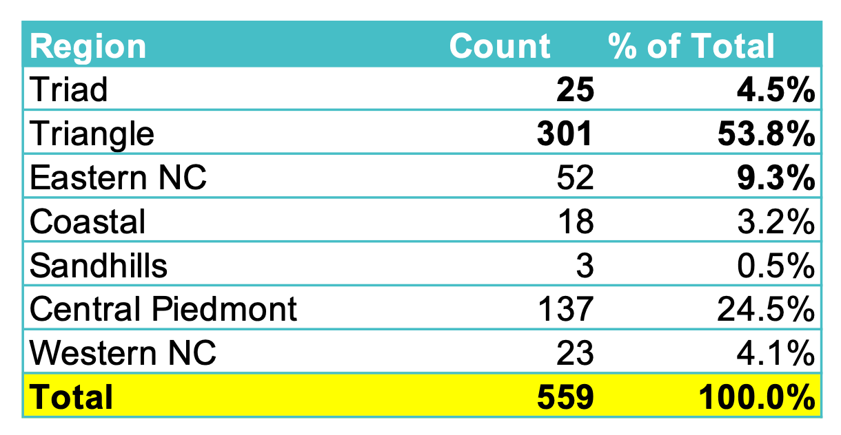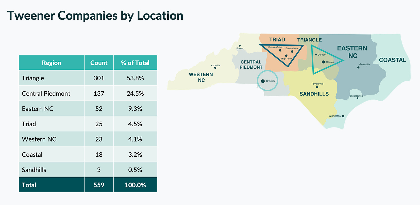 This year's list features 559 companies across North Carolina, including 268 brand-new additions. The Triangle continues to anchor the state's Tweener ecosystem with 301 companies (54%), followed by Central Piedmont at 136 (24%), with meaningful representation from Eastern NC, the Triad, Western NC, the Coast, and the Sandhills.