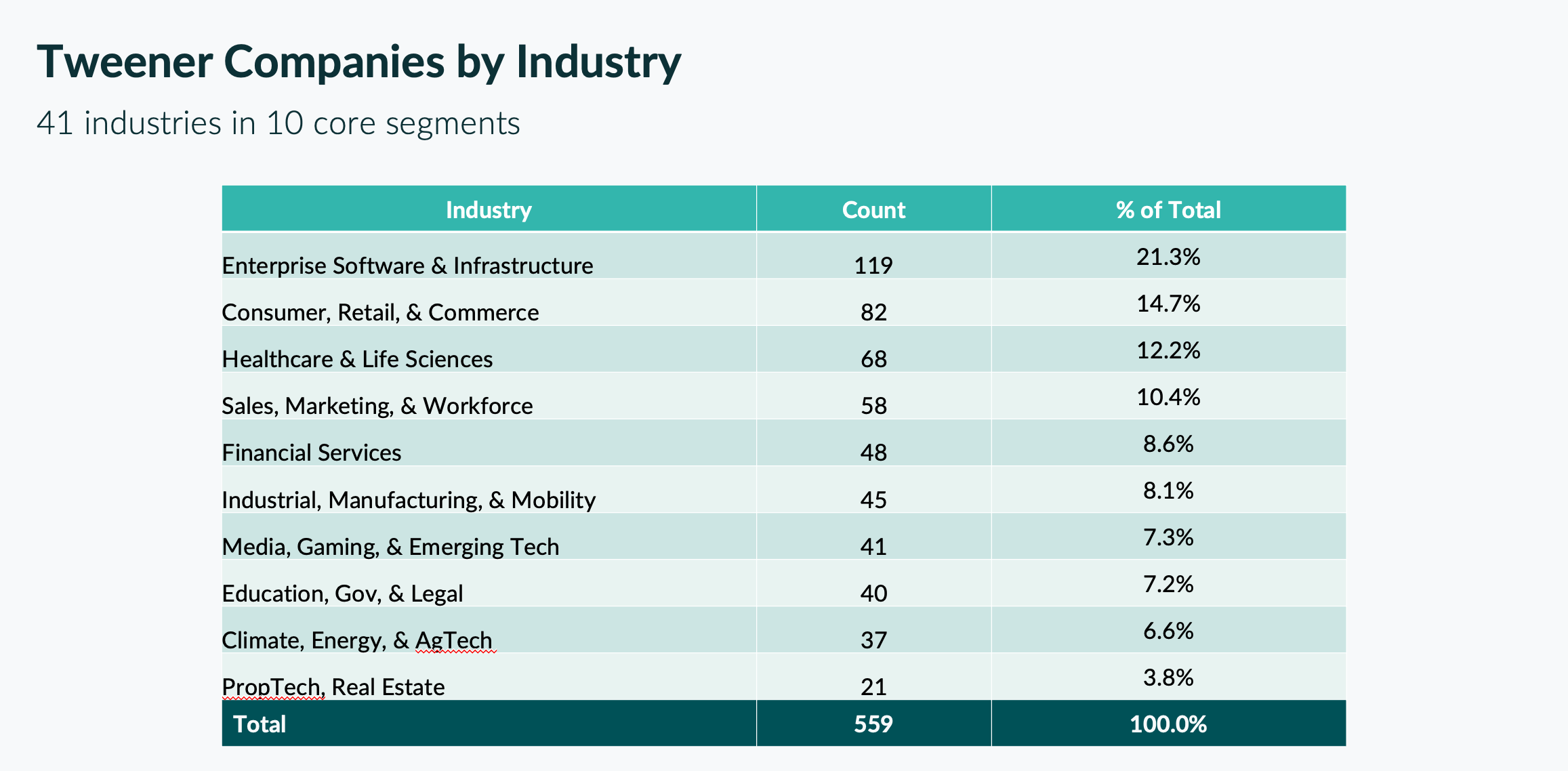 The list spans 41 industries across 10 core segments, with Enterprise Software & Infrastructure (119), Consumer & Commerce (82), and Healthcare & Life Sciences (68) leading the way.