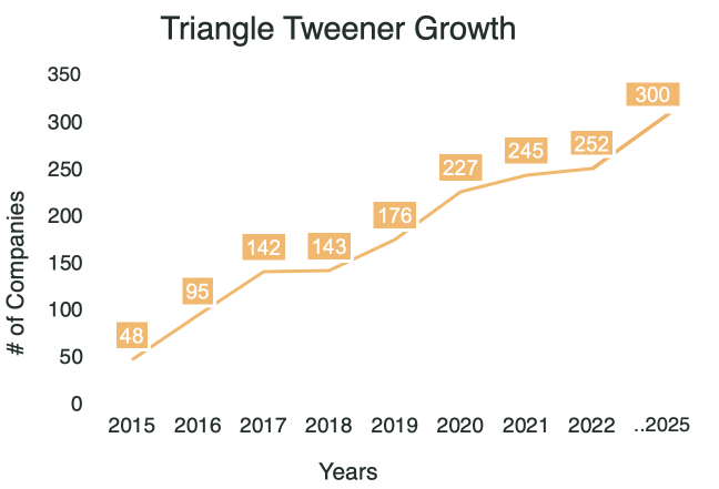As part of this index strategy we set the goal to invest in as many of the ~300 Triangle Tweeners as possible. Some are bootstrapped and some are later stage, so we knew that 300 wasn’t possible, but 200 was definitely do-able.