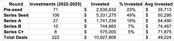 Series A - 27 deals or 12% of our deals but 16% of the capital ($1.7m at $65k average check size). The bulk of these are from companies in the 2022/2023/2024 investments that grew fast and raised add-ons.