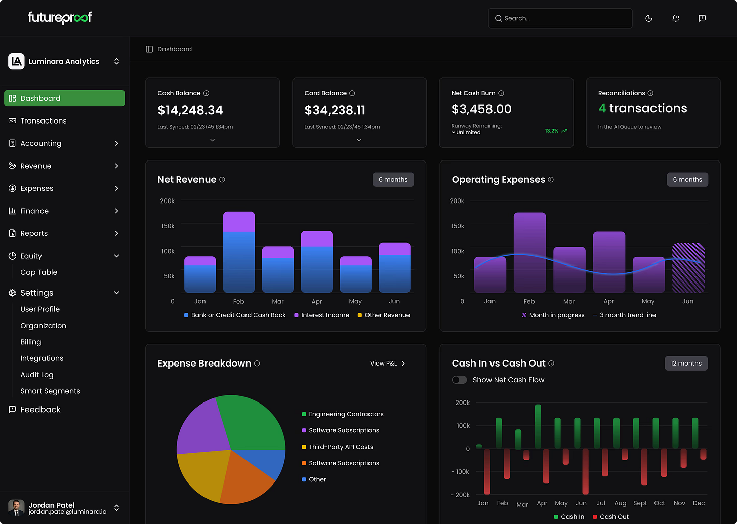 Futureproof has early customers live and a full platform rolling out: AI-assisted bookkeeping, forecasting & planning, cap-table modeling, and a built-in data room. It’s a single financial operations layer so founders aren’t juggling five tools and ten tabs.