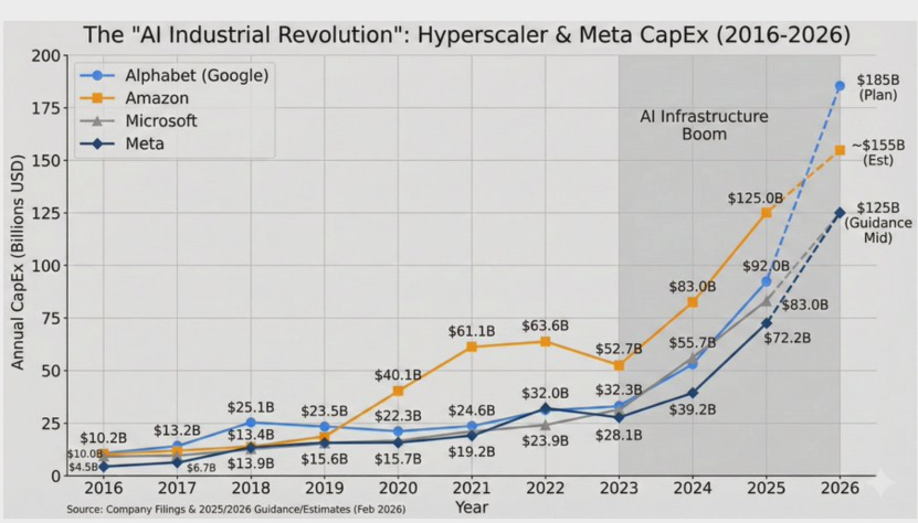 Starting with META on Jan 28, each company that has large datacenters: Google, Amazon, Microsoft and META, announced their Q4 2025 results. At the end of the fiscal year it’s customary to provide the forward year’s guidance (2026 in this example). Wall St. knew this would go up, but they never expected it to DOUBLE and…yep…it did→