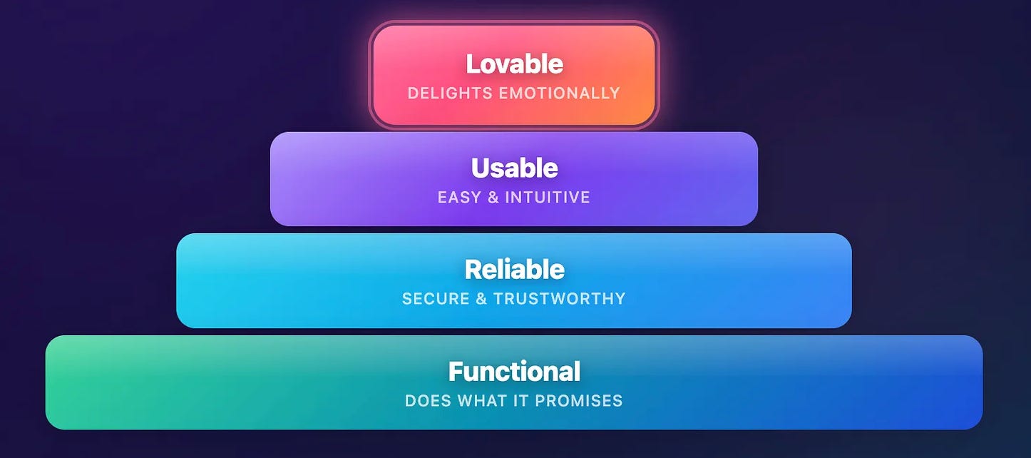 Her case is simple: building “functional” is becoming a commodity. Your users can find 12 alternatives or rebuild it themselves. So, the new baseline is MLP, the earliest version that’s genuinely lovable. “Lovability” is a defensible moat because AI can match features fast, but it can’t easily copy the emotional relationship people have with a product (yet).