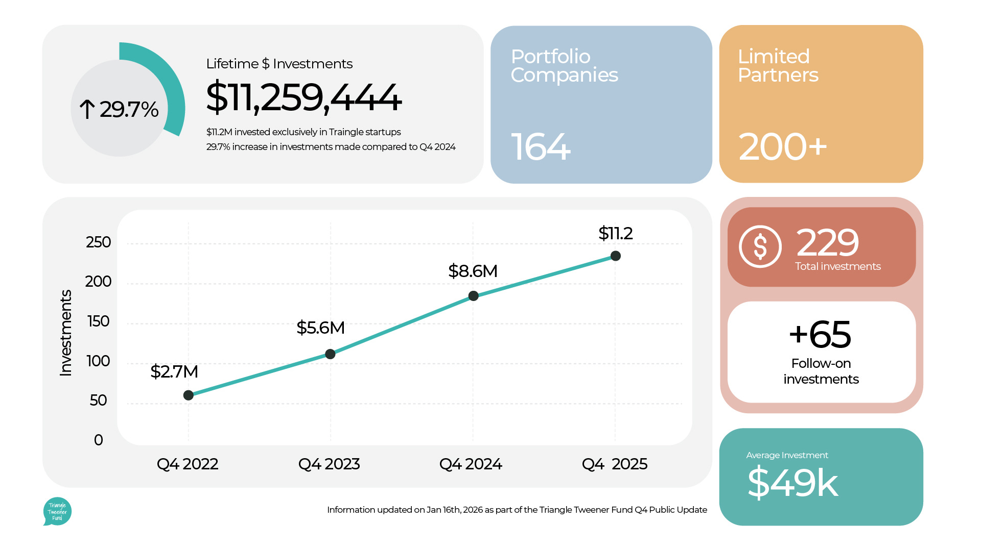 Q4 Tweener Fund highlights: $575K deployed across 9 deals (2 new, 7 follow-ons), bringing us to $11M+ invested into the Triangle’s startup ecosystem across 164 businesses.