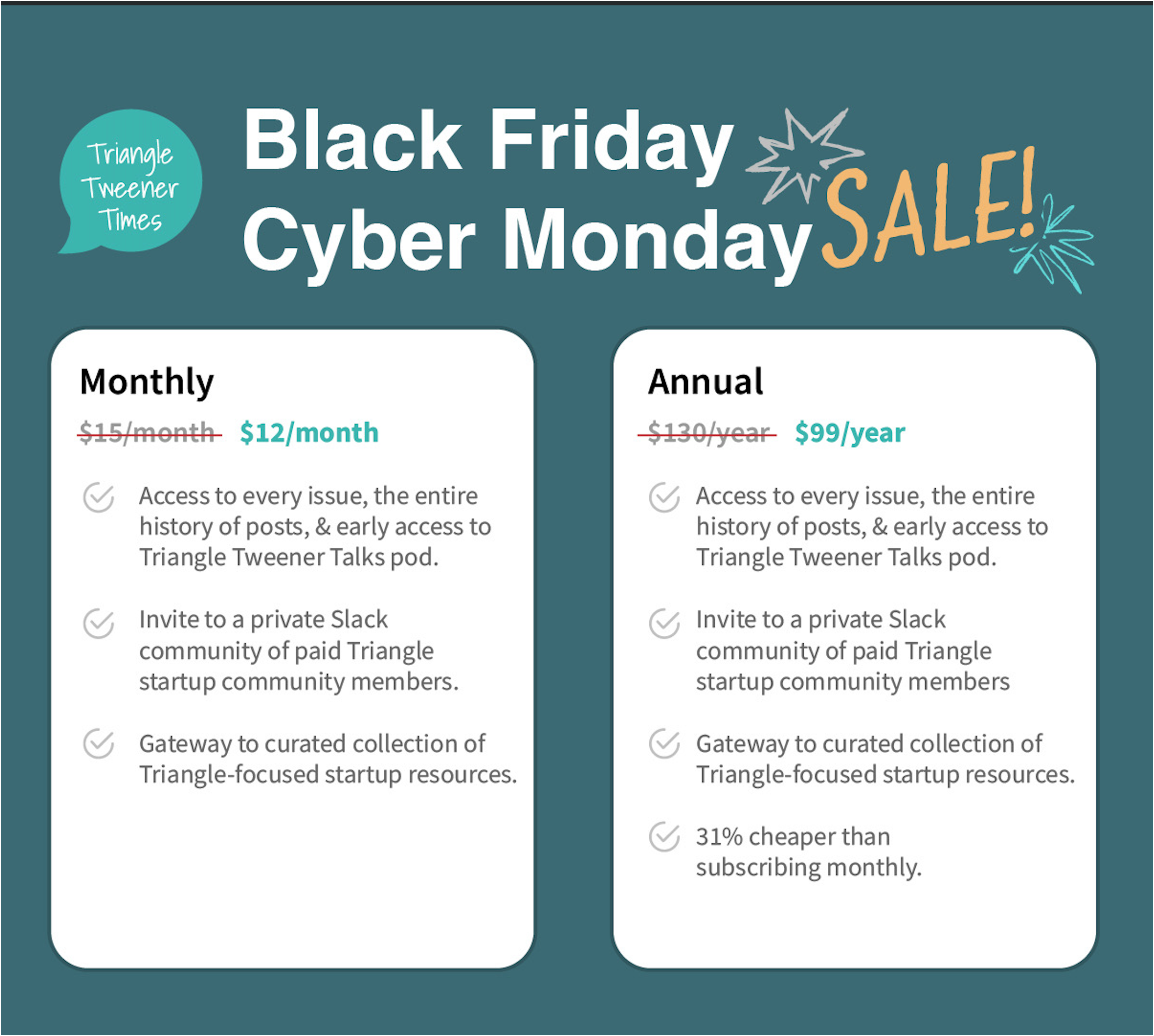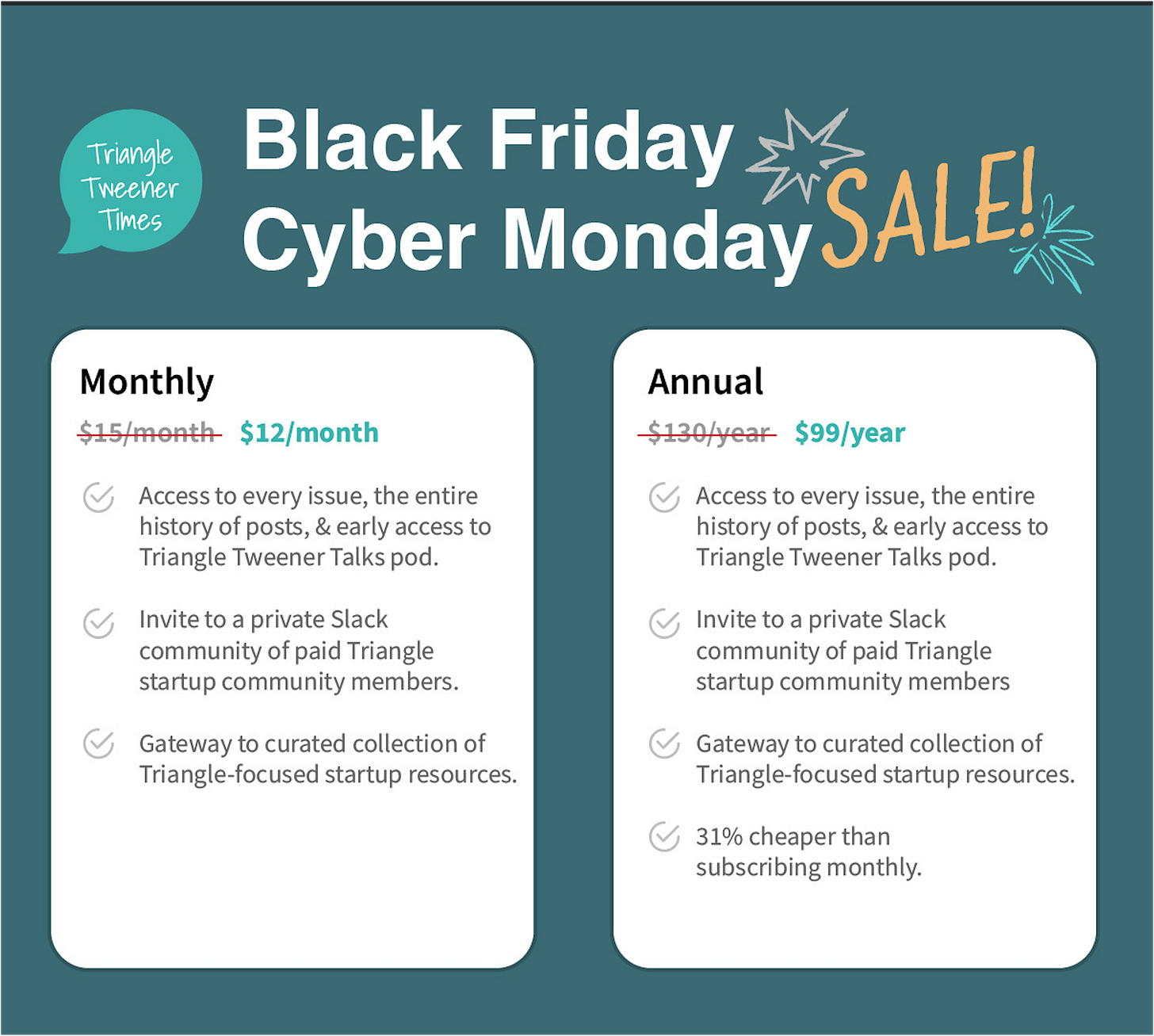 We are 100% subscriber supported and all of your subscriptions go to helping us improve programming (content, pods, events, more coming) focused on Triangle area founders.